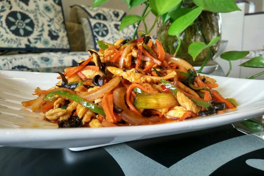 胡萝卜、鸡胸肉、泡发木耳、葱、姜、蒜、蚝油、腌肉料:、盐、青尖椒、生抽、生抽、油、油、鸡精、白糖、清水、淀粉、陈醋、辣椒酱、酱汁料: