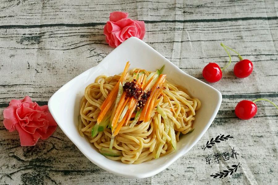 鸡蛋、面条、花生米、碗豆苗、醋、蒜、盐、芝麻酱、耗油、甜面酱、味极鲜、老抽酱油、拌面料黄瓜