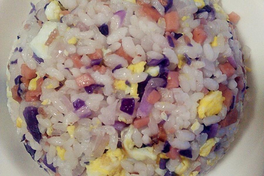 火腿、鸡蛋、洋葱、紫甘蓝、冷米饭、盐、油、鸡精