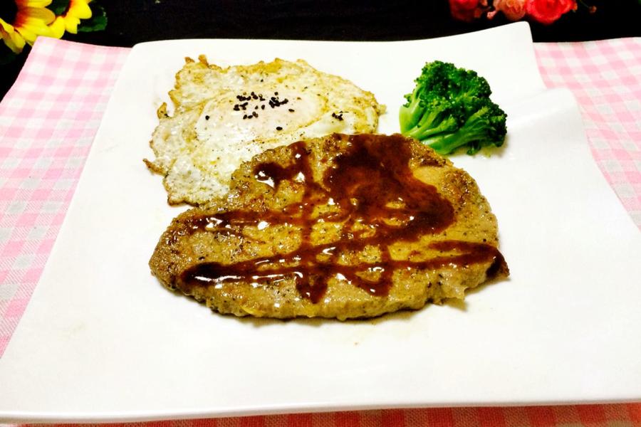 鸡蛋、西兰花、牛扒、黄油、黑胡椒酱