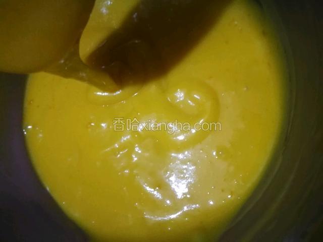 1.烤箱提前160度预热10分钟。容器中加入鸡蛋,油,水搅拌均匀后用打蛋器打发5分钟。如图划八字几秒不消失即可。