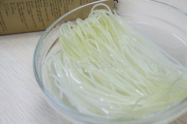4.将干米粉放入冷水浸泡10分钟左右,或将米粉放入沸水浸泡5分钟。