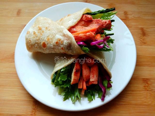 5.把生菜,胡萝卜丝,黄瓜丝,紫甘蓝丝,鸡胸肉条放入饼中卷好,一道美味的低脂鸡肉卷就做好了