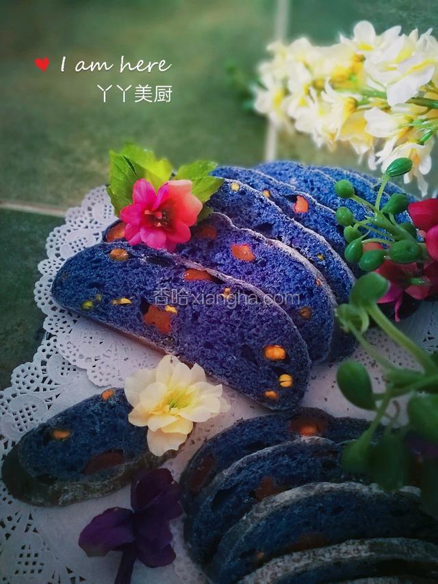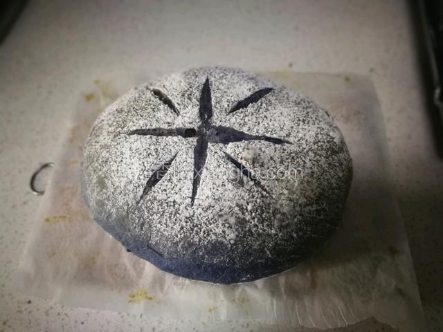 4.厨师机盆里先放180克蝶豆花汁,放入高粉,盐和糖对角放,中间放酵母粉。