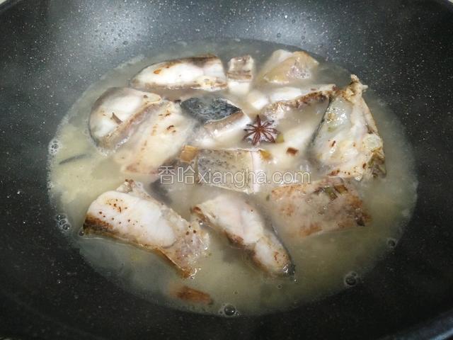 4.倒入鱼块,不能来回翻,拿起锅轻轻晃动,中火将鱼块两面煎至微黄。