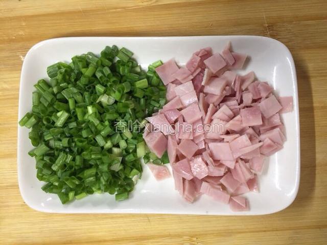 3.火腿片切小块,香葱切葱花