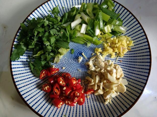 2.小米椒,姜蒜切粒,葱,香菜切段。