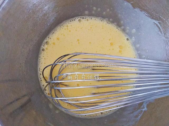 3.称入酸奶,玉米油,白糖6g加到盆里,再分离蛋清蛋黄,加入蛋黄。分离的蛋清要装到无水无油干净盆中。 (如果你的酸奶是甜味的,可以不放这6g白糖,我用的自制酸奶带甜味的,所以白糖省略了)