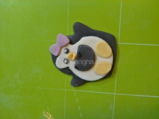 6.取适量黑色擀平用圆形裱花嘴压个圆形,揉两个小圆点儿。