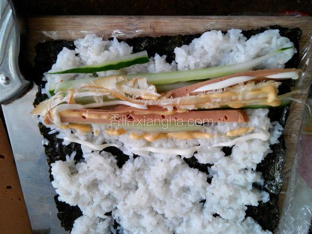 1.白醋,紫几菜,青瓜,火腿肠,糖,盐,鱿鱼丝,千干酱,沙拉酱,珍珠米