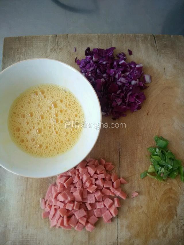 1.火腿,紫甘蓝切丁,鸡蛋大成蛋液