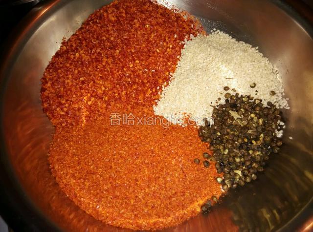 1.将尖椒面,红椒面,花椒,芝麻放入不锈刚盆中,把它搅拌均匀,为了好吃,我又放了一个蒜头末,一个香叶片,少许盐。(不喜欢也可以不放)!