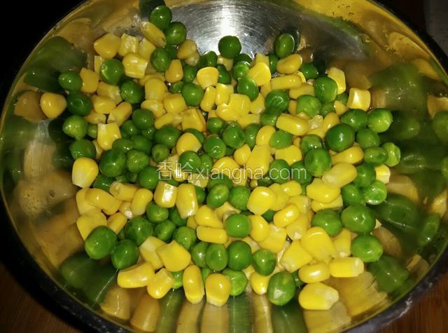3.把胡萝卜丁先放入开水锅里汆烫,再放青豆和玉米