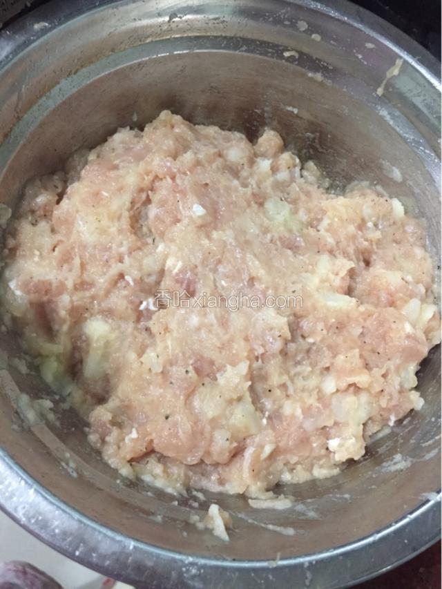 4.猪肉碎放酱油,即磨胡椒,盐,生粉,抓均勻,备用。