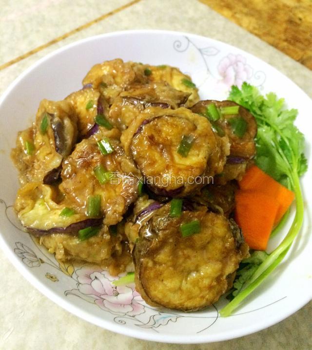 3.茄子切成图片的大小,中间切一刀,不要切断