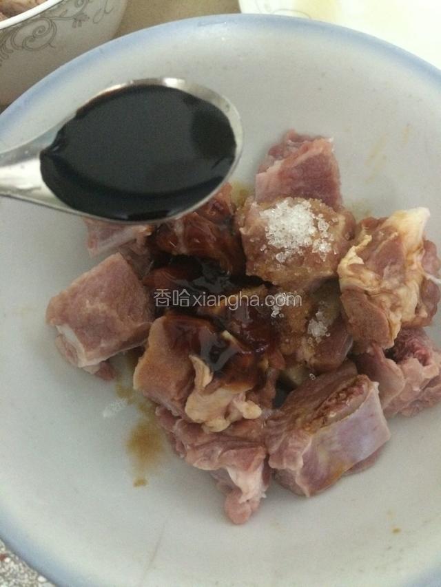 4.排骨用适量的盐,糖,蚝油,生抽,腐乳汁,老抽搅拌均匀腌制15分钟…