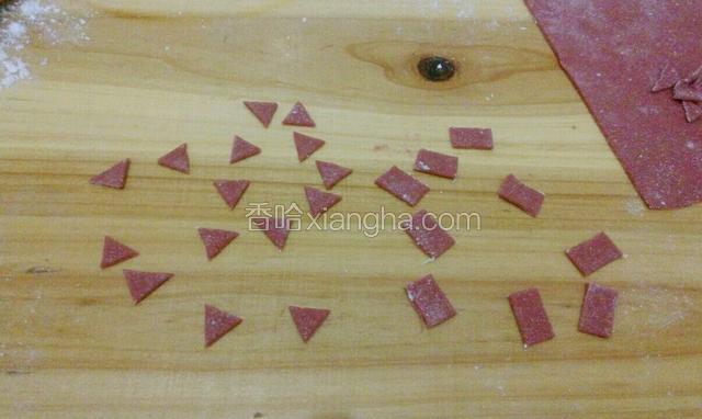 2.少许面粉与红曲粉混合,加水和成红色面团备用