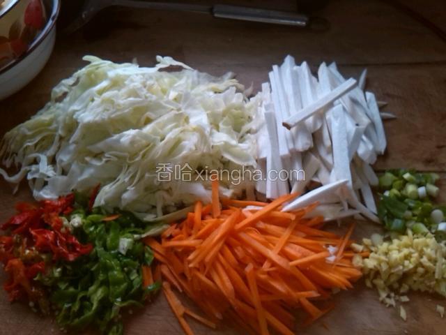 4.肉切丝用料酒,胡椒粉腌一会倒少量淀粉拌匀