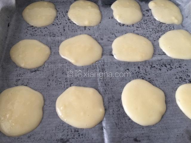 4.用勺子舀一些面糊倒在铺了油纸的烤盘上,面糊自然滴落流淌,之间要留空隙;