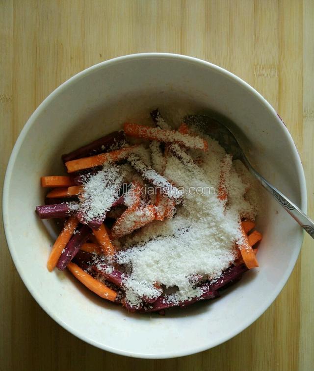 1.紫薯一个,红薯一个,橄榄油一勺,椰蓉1/3杯