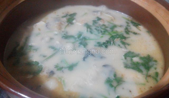 6.三十分钟后,往汤里倒入姜煲五分钟,然后放适量盐,倒入香菜,关火,鲜美的豆腐鱼头汤,完成啦!