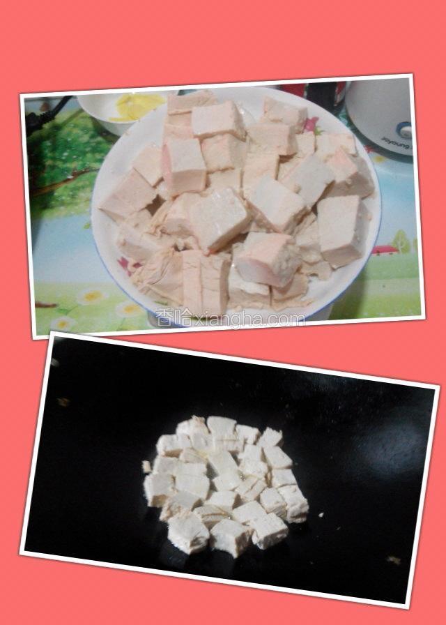 2.豆腐切方块,放入炒锅内煎表面微黄,捞起备用.