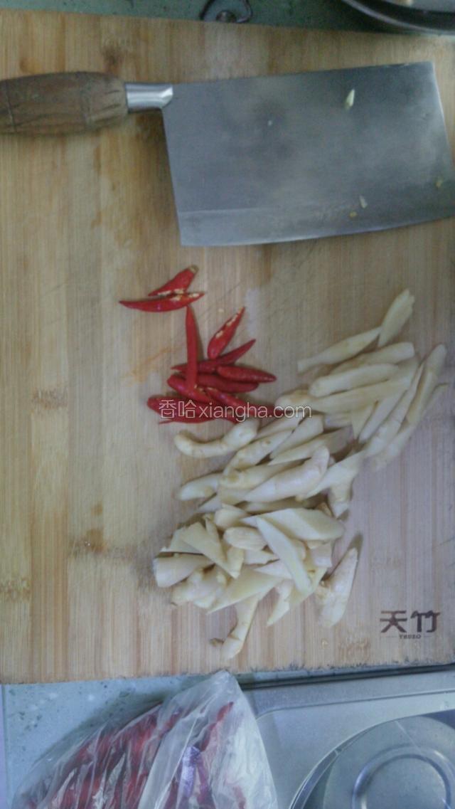 4.老抽拌匀后加入仔姜、小红椒翻炒。