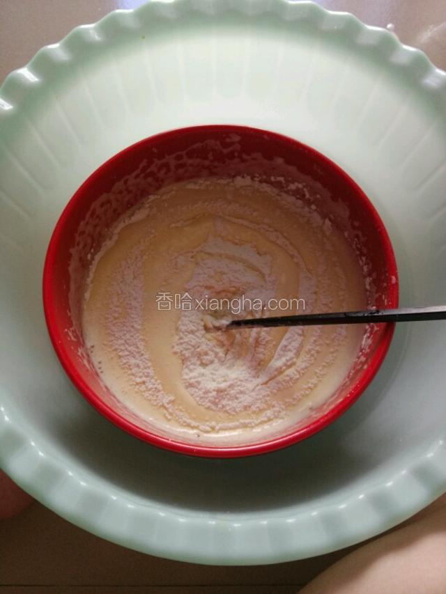 3.将鸡蛋敲开放进碗里,用打蛋器将鸡蛋打发。(注:有条件的可在打蛋的那个碗下面加一盆温水,助于打发。打发时间大约需要25分钟)