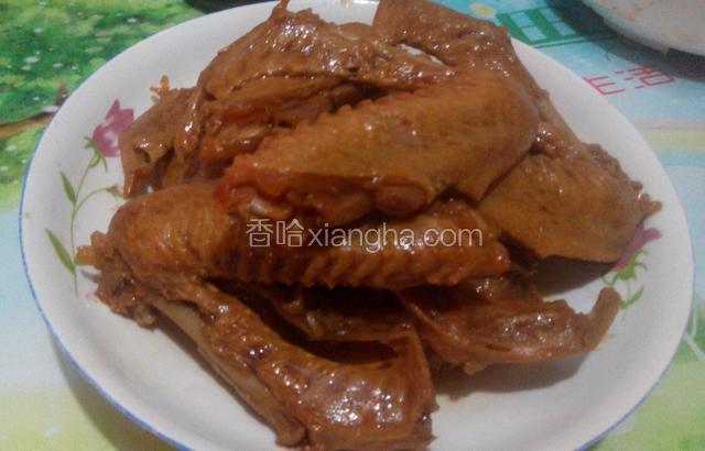 5.完成图4,把鸭翅中和鸭翅尖斩开,然后装盘,装盘时把鸭翅尖放底下,鸭中翅摆上面.摆好后往盘中鸭翅淋上卤水汁.ok啦!
