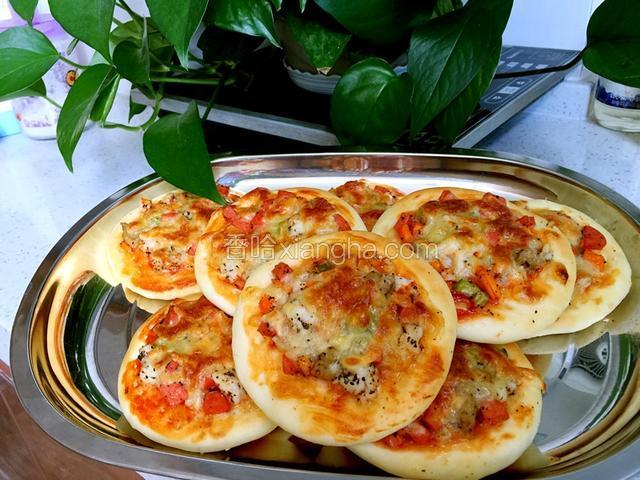 4.早晨取出面团排气,分割成45克左右的小面团滚圆,再一个一个的擀开,最后用手整形成披萨饼形状