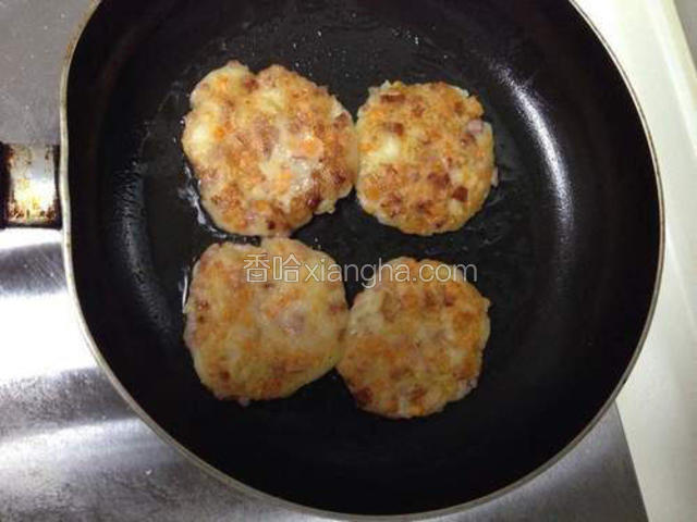 6.锅内放油烧热,手掌放油,取鸡蛋大小的土豆泥搓圆、压扁,放入锅内小火煎