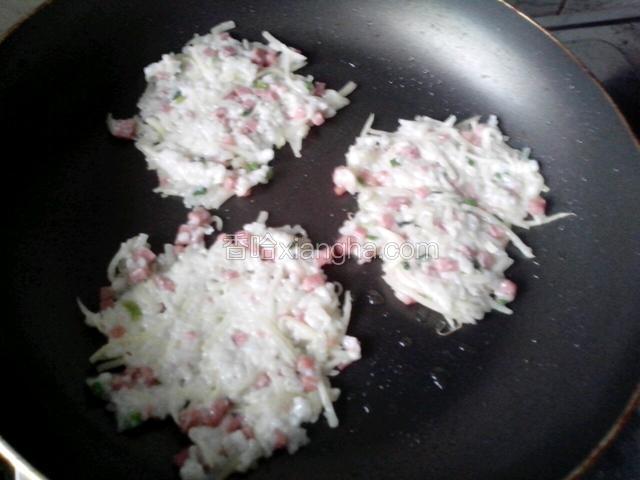 5.平底锅预热,放入油。把馅做成小团放平底锅里拿木铲子按扁