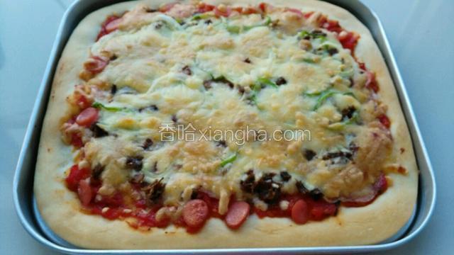6.披萨盘或烤盘刷油,将面团擀成饼放入烤盘,再醒发10分钟,用叉子插洞。