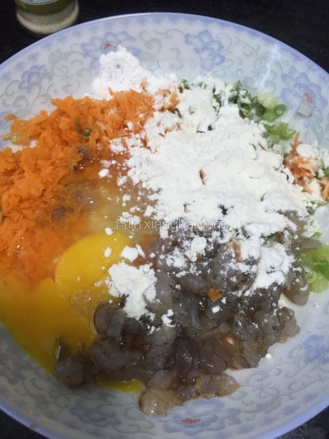 5.加入盐,胡椒粉少量玉米淀粉和面粉,搅拌均匀