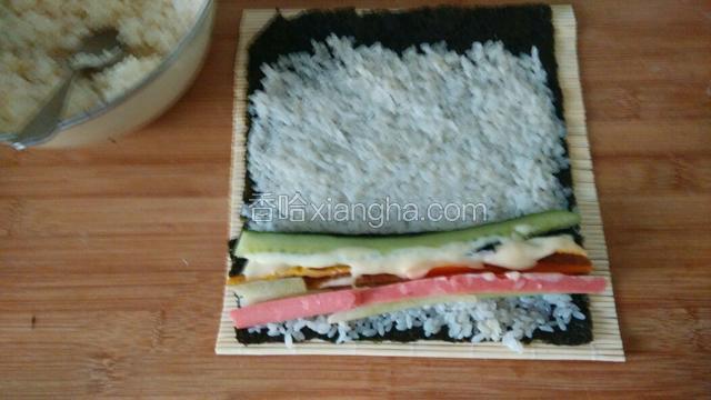 4.切好的东东摆在米饭上加上拌好的萨拉酱