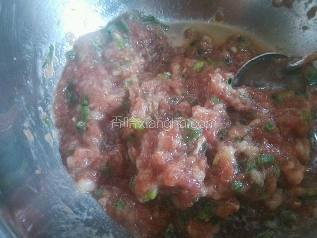 4.猪肉适量的加盐,鸡精,酱油,搅拌均匀后再慢慢加入水,这样做出来的肉包子才有汤汁