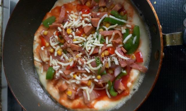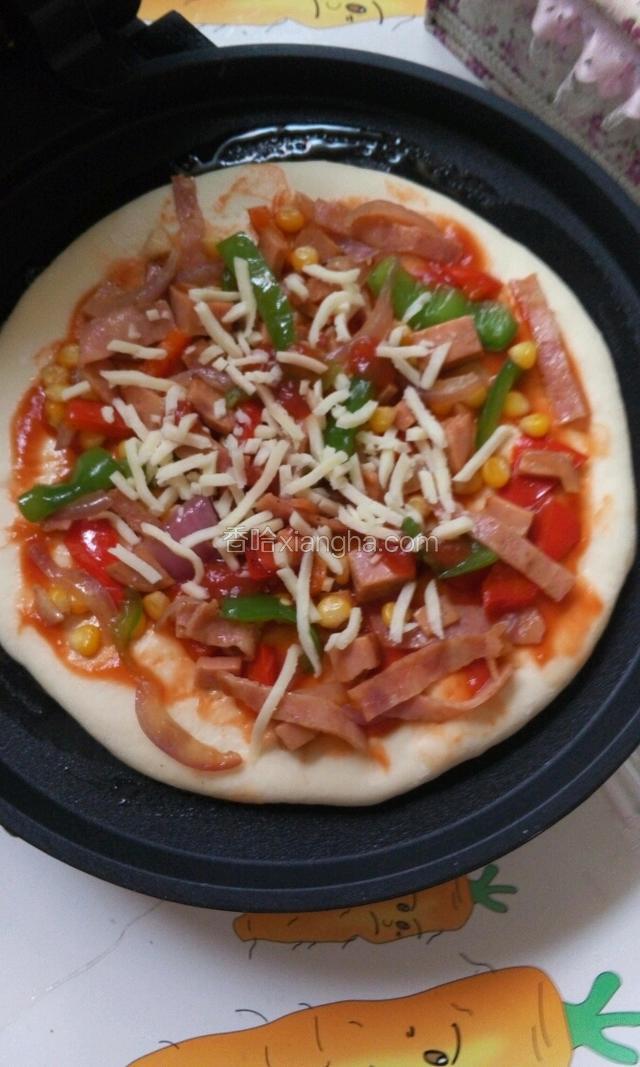 5.饼上先抹番茄沙司,然后在放上炒好的食材,最后上面撒一层芝士