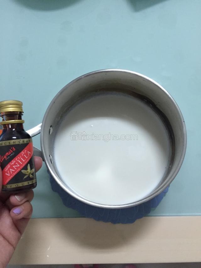 3.把350ml牛奶倒入奶锅,加热到微微沸腾,其中加入几滴香草精,充分融合,(牛奶多点、少点都没关系,不用特别精确)。