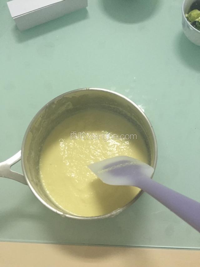 5.然后把装牛奶蛋黄糊的锅放在小火上边搅边加热,千万不要煮沸了(要是温度太高了,就把蛋黄糊离开火源,待温度有点降下后再放上去加热),直到蛋黄糊变的浓稠,放凉备用。