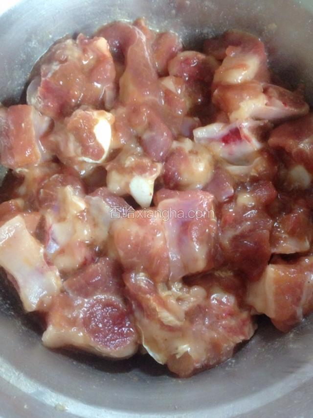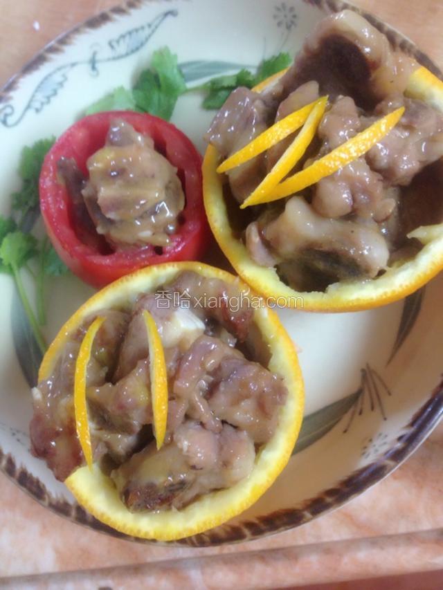6.热锅加入橙汁调汁,半碗果汁半碗水烧至黏稠即可下排骨搅拌均匀。
