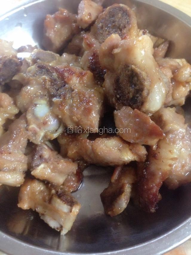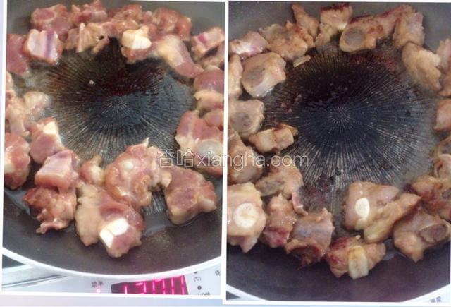 4.热锅热油,排骨下锅煎,两分钟就翻另一面煎至表面焦嫩。
