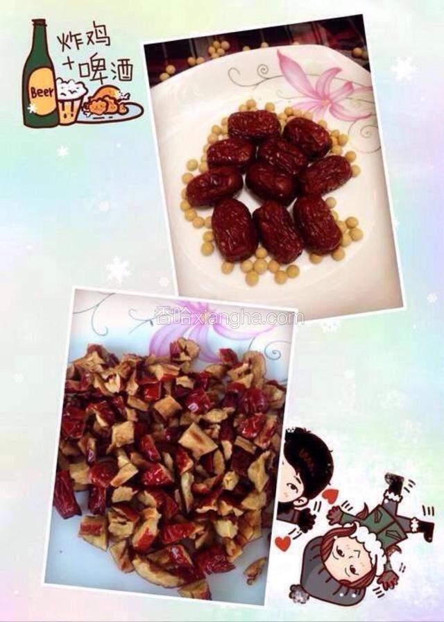 3.把泡好的黄豆与红枣倒入豆浆机中、加入适量的清水(水的分量按个人喜好添加!我喜欢香浓一点 所以只加了1000m l)