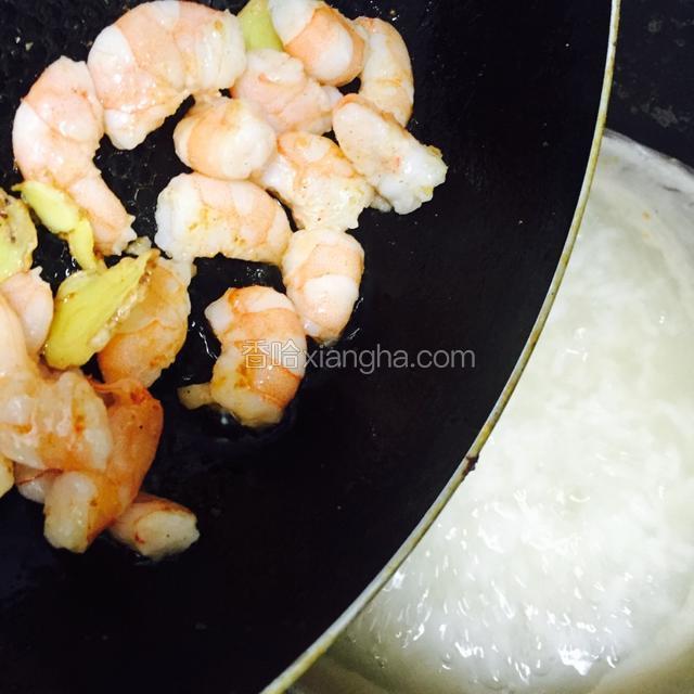 5.重新用个锅倒入一点油炒一下虾仁,然后把虾仁倒入煮至粘稠的粥里