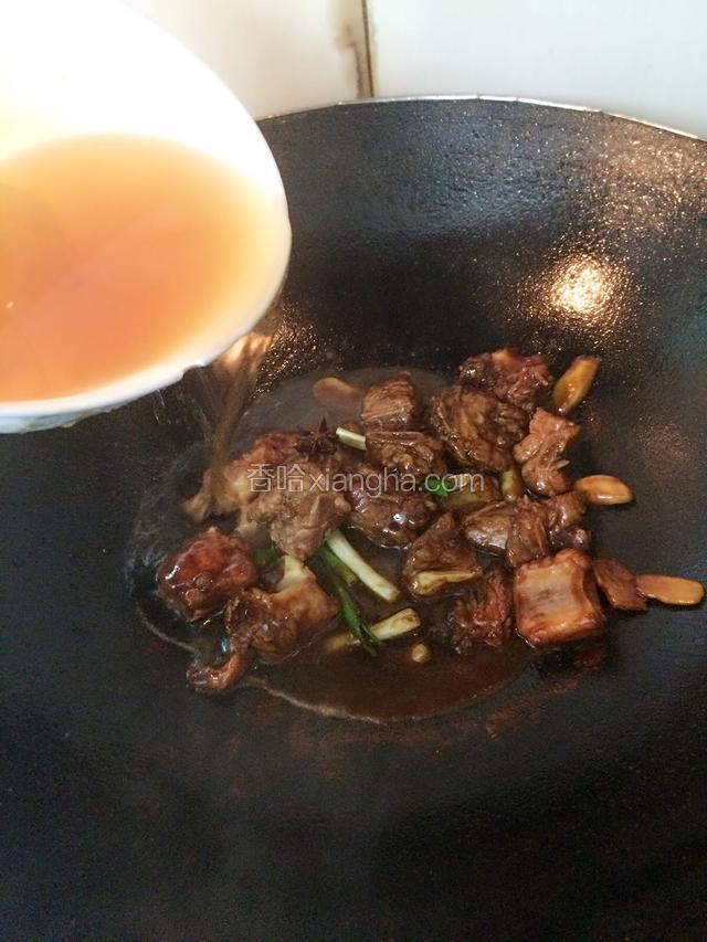 6.排骨倒入一个容器,倒入2勺料酒,2勺生抽,2勺蚝油,5克盐,5克糖,5克十三香粉1勺老抽…腌制15分钟,勺子如图片中大小的铁勺子