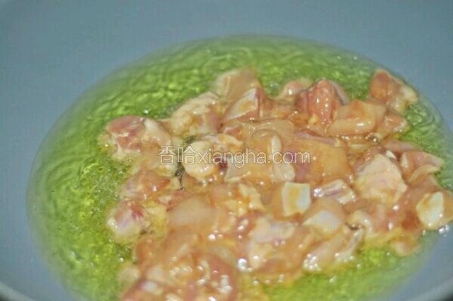 3.炒锅里加入比平时炒菜多1倍的油,中火烧至五成熟,将兔肉入锅里滑炒至散,控去多余的油