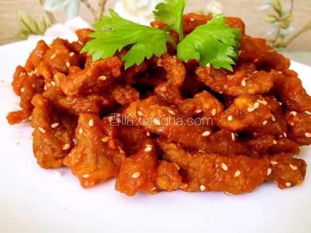 6. 加入炸好的里脊肉翻炒均匀,使其均匀的裹上酱汁