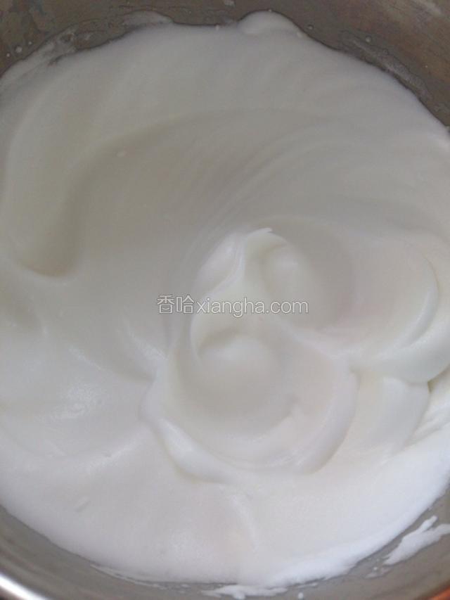 4.预热烤箱150度。蛋白分三次加入白砂糖,打至干性发泡。提起打蛋头,直立的尖角状态。