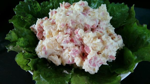 5.把蒸好的土豆晾晾,碾碎和火腿肠,沙拉一起拌匀。