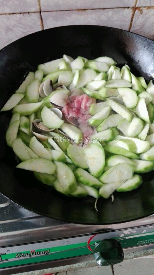 2.锅里放水烧开,放入白贝焯下水,捞出