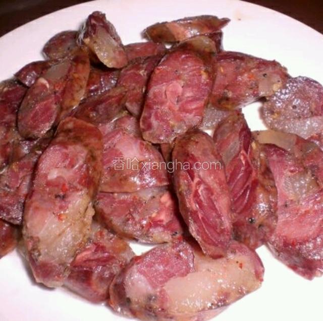 3.广式腊肠也浸泡10分钟,拿出来切片